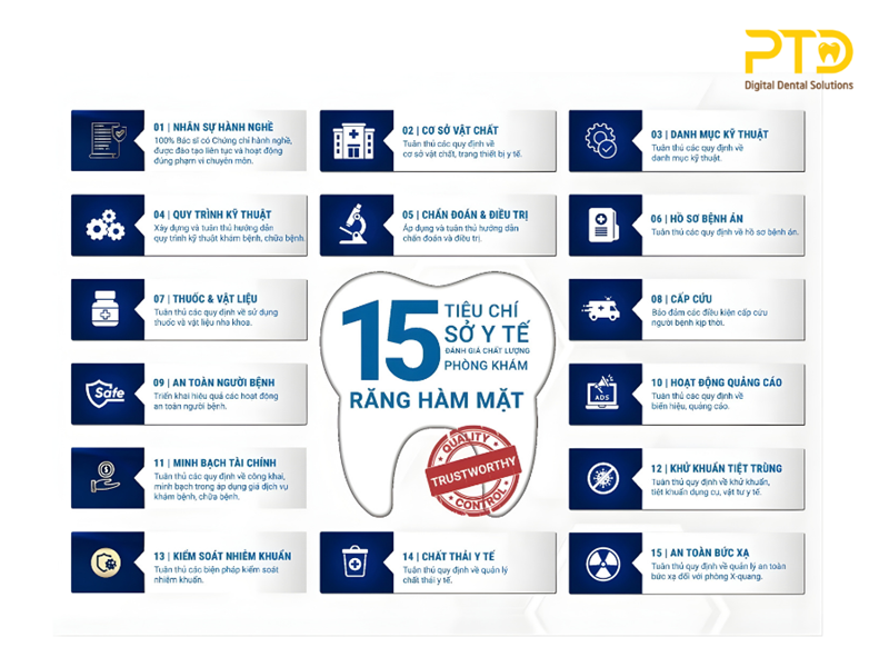 Dưới đây là nội dung của 15 tiêu chí đánh giá chất lượng phòng khám Răng Hàm Mặt do Sở Y tế TP.HCM công bố:- Tuân thủ các quy định về nhân sự tham gia hành nghề khám bệnh, chữa bệnh.